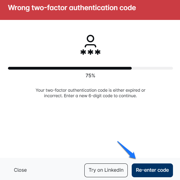 Facing a Two-factor authentication error? This can occur if the 2FA code expires or is entered incorrectly. Simply click Re-enter code to restart. Remember, the code is valid for 1 minute. Enjoy your adventure! 🚀💙