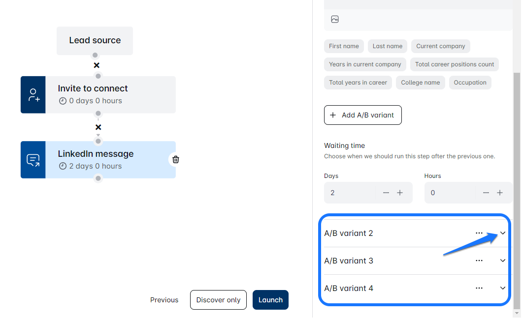 - In Massive Dynamics, you can test different parts of your message copy, such as LinkedIn messages, Emails, InMails, Invites to Connect, or even the timing between the steps during the campaign sequence creation process. You can create up to 5 different test variants!