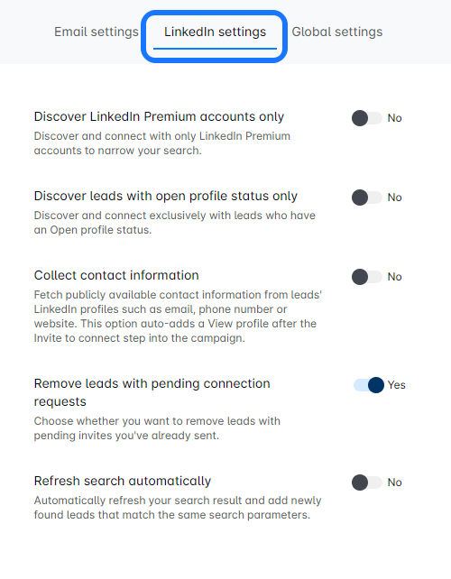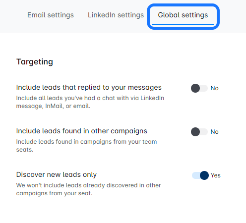 - Discover new leads only: Activate this to exclude leads already in other campaigns for your seat.