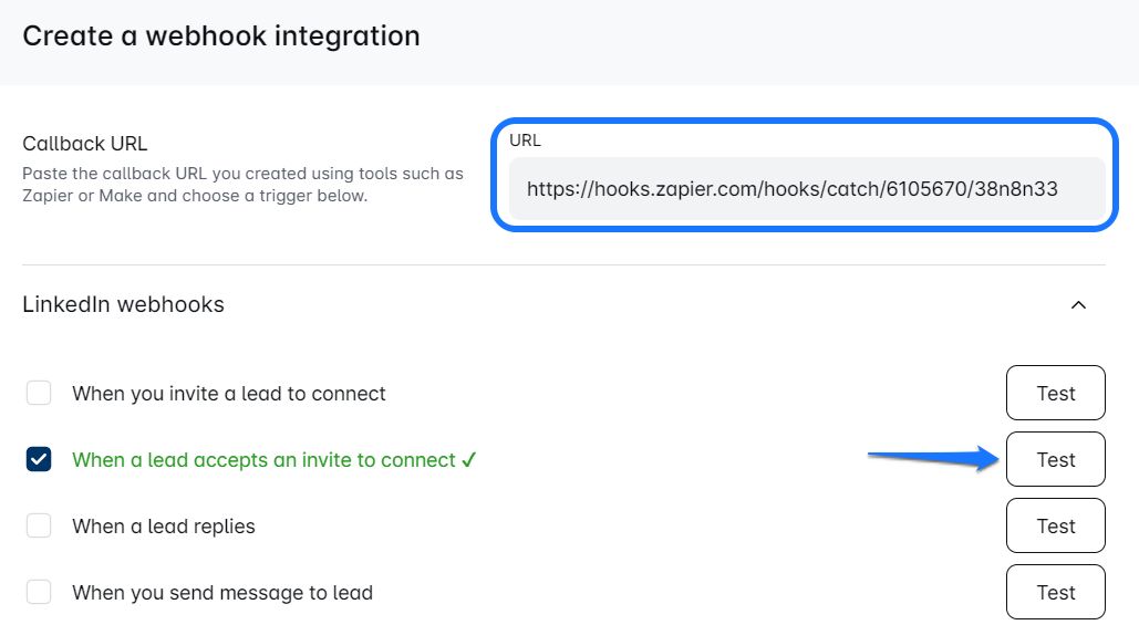 In the Test section, paste the Callback URL Zapier generated earlier.